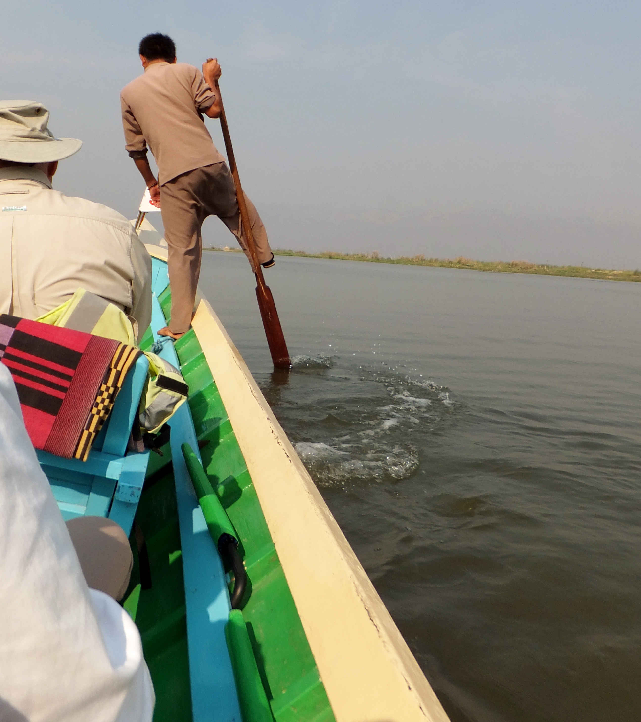 The Intha People are likely the first ethnic group that you will come across. They are members of a Tibeto-Burman group and are believed to have come from Dawei area farther south. They support themselves through agriculture and fishing. You will encounter their one-legged rowers on the way to your hotel. This distinctive rowing style, which involves standing at the stern and wrapping the other leg around the oar, evolved as the lake is covered by floating plant material and it is impossible to see ahead if seated. There are about 70,000 Intha in towns and villages around the lake. There are also a mix of other Shan, Pa-O and Palaung, Danu and Barmar groups. Transportation on the lake is traditionally by small boats, or by somewhat larger boats fitted with ‘long-tail’ motors that are necessary because of the usual shallowness of the lake. We travelled in one of these larger boats that sat 5 people quite comfortably.