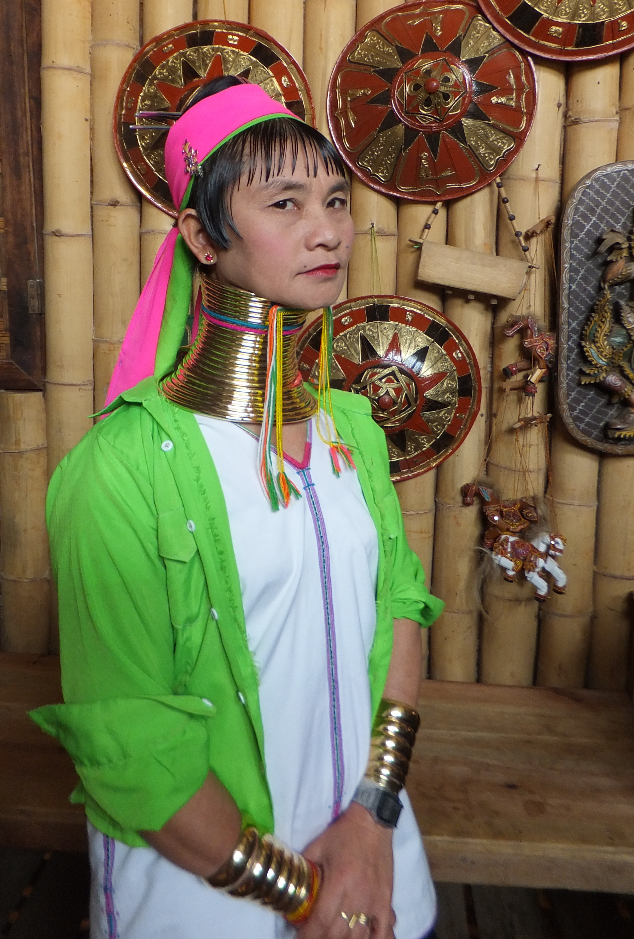 We went into the shop to meet the Palaung women who wear brass coils around their necks. There was a 40 something woman, an older woman of indiscernible age and 2 young teenage girls. We learned that the neck stretching process starts at age 9 and the number of coils is increased at set intervals. A symbol of wealth, position and beauty according to tradition, the coils can stretch their necks over a foot and weigh over 20 pounds According to the Guinness Book of Records, the world record for longest neck—15¾ inches. These women are obviously being used to get the tourists into the shop but they do receive money to have their pictures taken. I felt conflicted as I stood there in the shop, wanting to take a picture while at the same time feeling that I was in a human zoo….. I didn’t like the feeling.