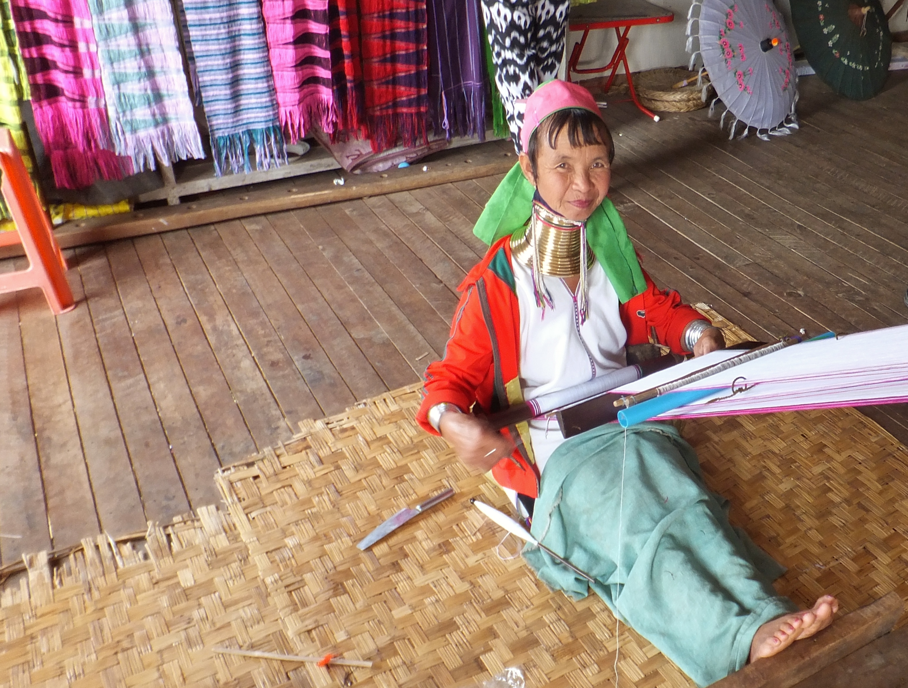 The women told us she had not put the coils on her daughters. It is common for the younger generation not to follow this tradition. It is however a way for these people to earn money for their families. I bought the red scarf on the rack made by the lady in the picture, as well as a number of other well made items from the shop. By now, my MADE IN BURMA wardrobe had grown so large, I would have to buy another suitcase or chuck some of the clothes I had brought with me, if I was to get it all home.