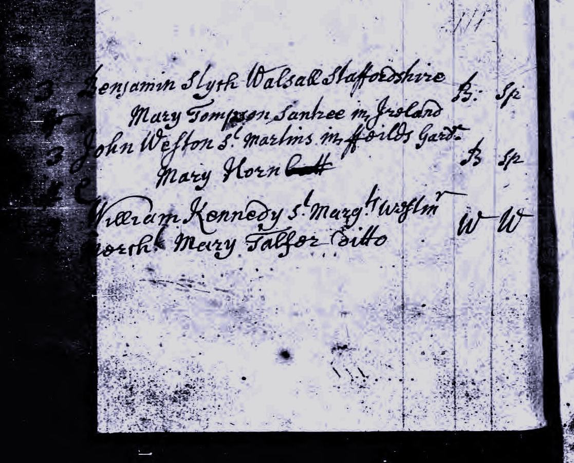 1717 Benjamin Slyth and Mary Thompson marry in London…..List Walsall as his abode