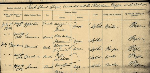 Ophelia Grose (Gwyndon’s Mother) was born 1862 and christened 1864 at the Sheik Ghaut Chapel Associated with the Presbyterian Mission of Sylhet. She was the daughter nof Benjamin Gilbert Grose and Marian ? Interesting to note other children named Grose were also christened at the same time.