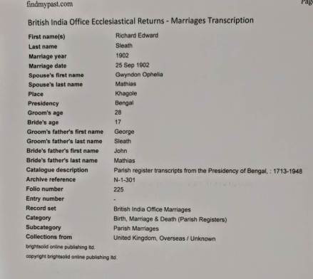 Richard Edward Sleath married Gwyndon Ophelia Mathias on 26 Sept 1902 at Khagole Bengal India