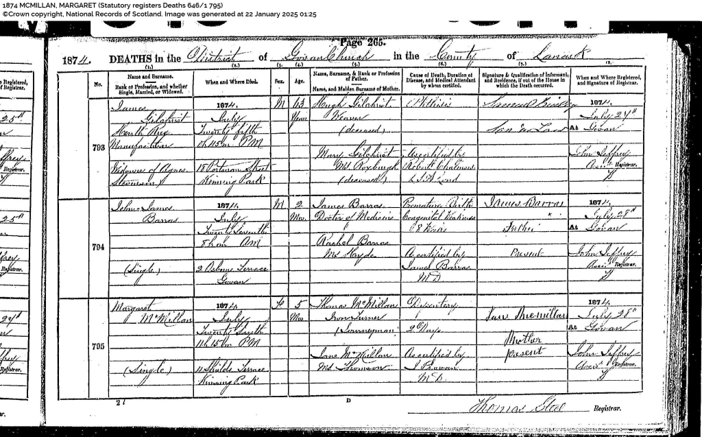 He had an older sister Margaret who was born on February 16, 1874 in Bridgeton, Glasgow Scotland. The family was living at 748 Gallowgate, Glasgow. She died on July 26, age 5 months, of dysentry and by then the family had moved and were living at 11 Shields Terrace, Kinning Park, Glasgow.