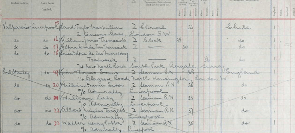 The other question was what had happened to David? My mother never spoke of him. I decided to see what I could discover about this man. David first appears on a document in 1917 when he heads to England to serve in WW1. He embarked from Valpariso, Chile destination Liverpool, England. He was 33 years old. (incorrect as he was born in 1879 and would be 37 at time of sailing in March 1917.) His address in UK was 2 Queen’s Gate, London, England. Occupation listed as clerical.