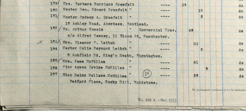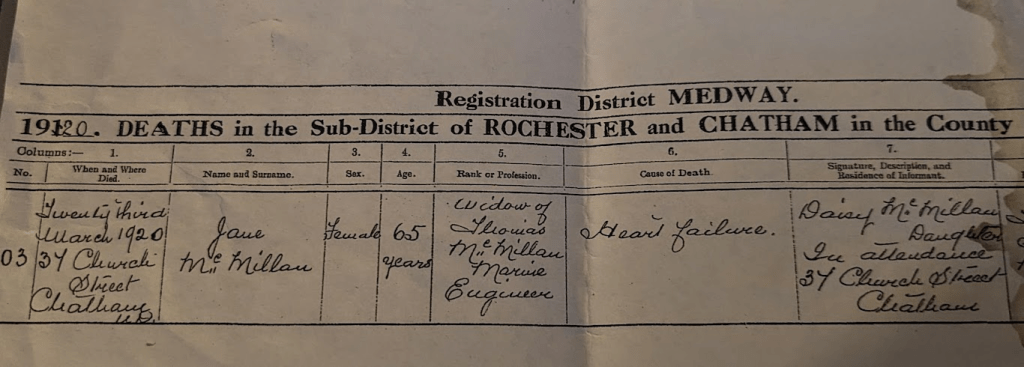 My mother remembered going to school in Maidstone. Jane McMillan, the matriarch, dies March 23, 1920 of Heart Failure. She was listed as 65 but as she was born in 1850 she would have been 70. They were living at 34 Church Street, Chatham, Kent.