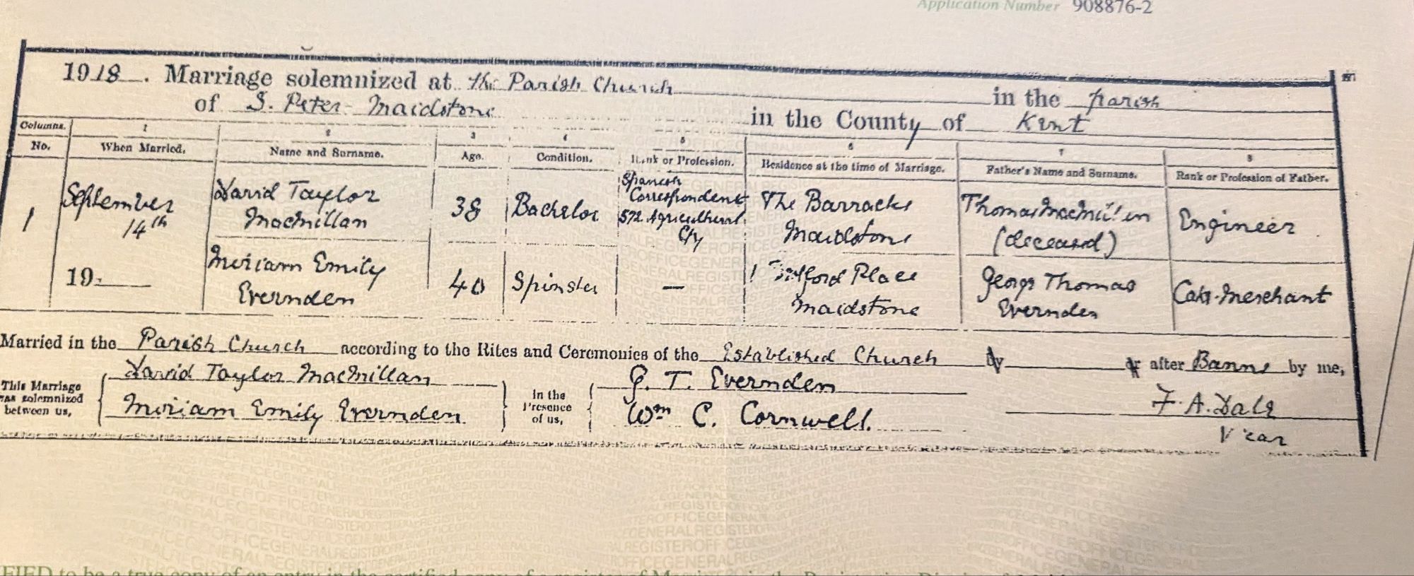 David marries Miriam Evernden, an English woman, in Maidstone, Kent on September 14, 1918.
