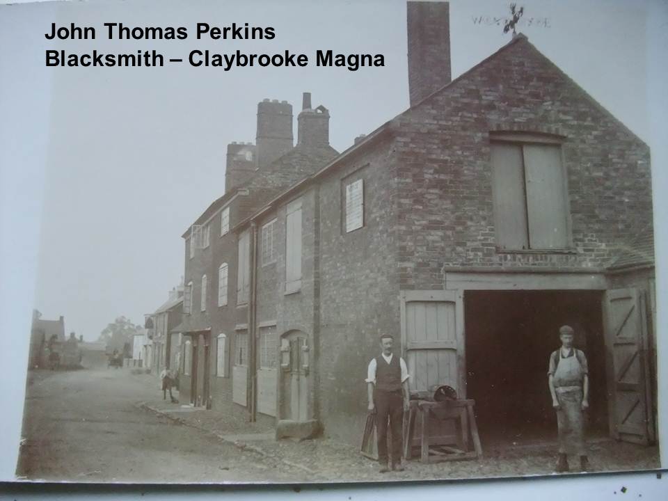 Tom Perkins told me that he was named after his uncle, the Claybrooke Magna Blacksmith. His uncle emigrated to Canada to make a better life for himself & family. Would our Tom have been named after John Thomas?(Possibly) Is John Thomas the man who emigrated & Tertius (3rd son?) would have gone too? Yes along with his wife Sarah Jane Sleath) Hence I ask if you are in Canada. Tom did tell me that the Perkins smithy also made most of the ironwork in the cemetery & around the churchyard. Sadly a lot of that was used for military purposes in WW2.”